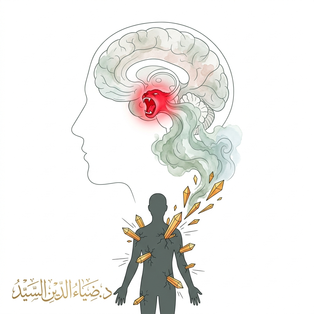 لفهم ما يحدث، يجب أن نتعرف على "اللوزة الدماغية" (Amygdala)، وهي مركز الخوف والإنذار في الدماغ، والمسؤولة عن تفعيل استجابة "القتال أو الهرب" (Fight or Flight).